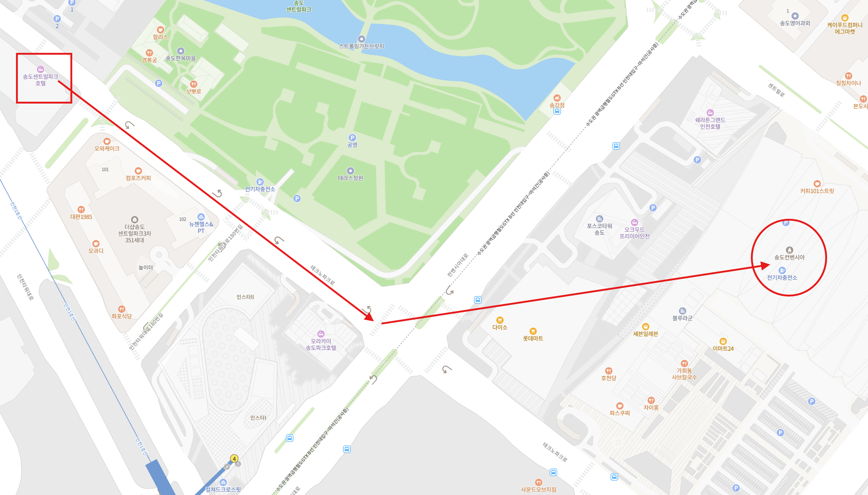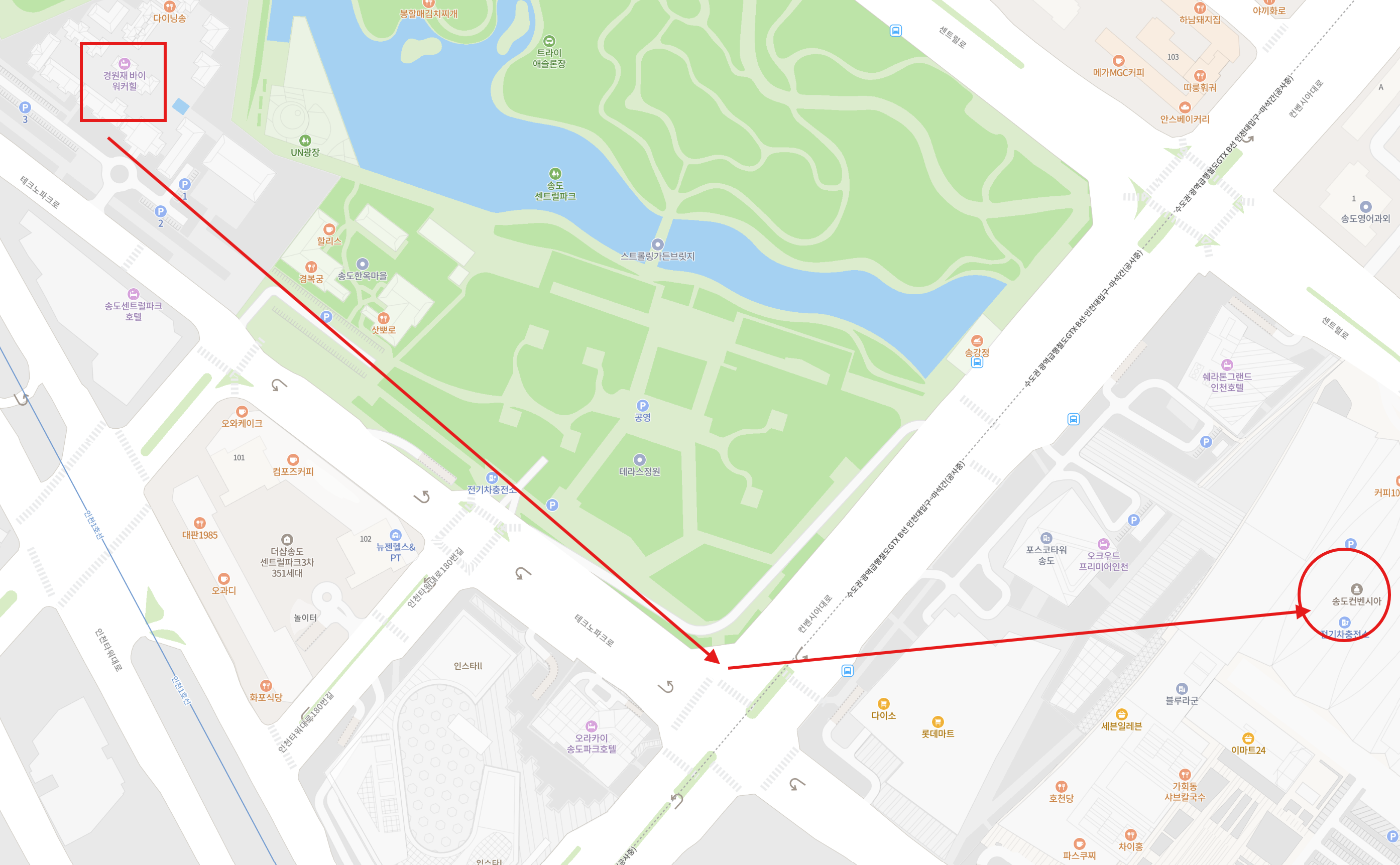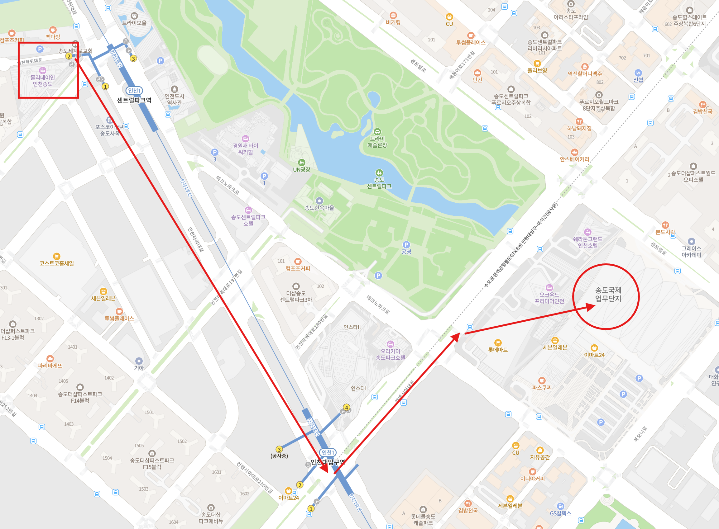 - 거리: 도보 15-20분, 인천 1호선 센트럴파크역 2번출구와 바로 연결