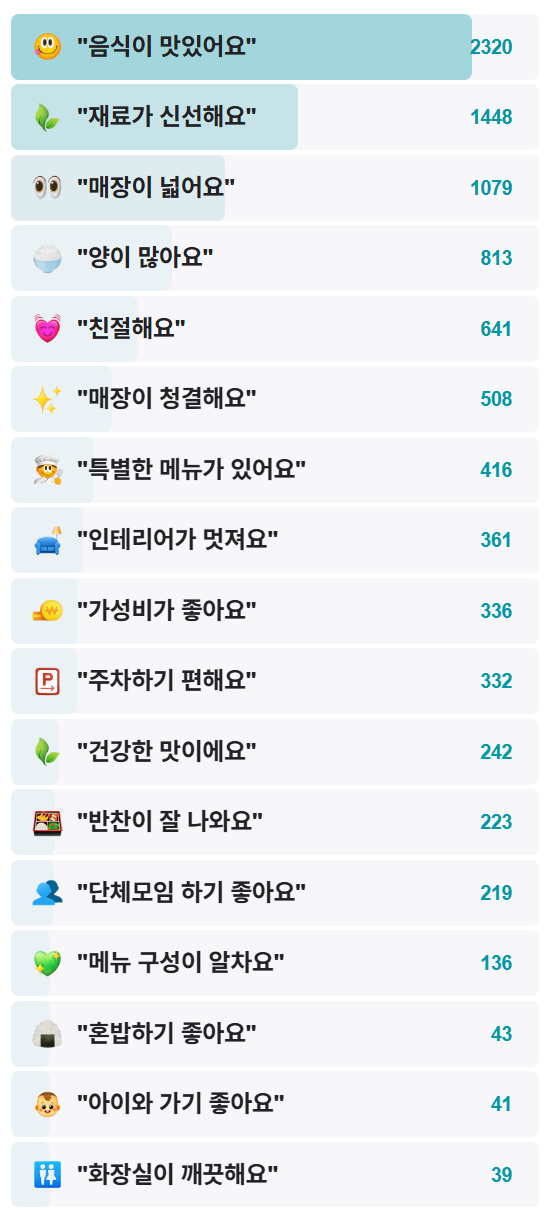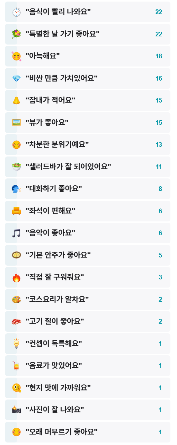 - 기타: 매장 넓고 테이블 간격 넓어 회식 장소로도 적합
