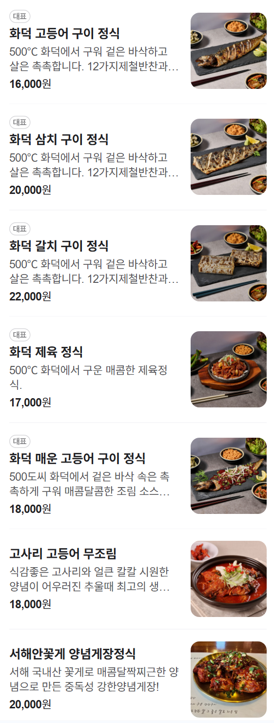 | 화덕 고등어 구이 정식 | 시그니처 / 밥, 반찬 포함 | 16,000원 |