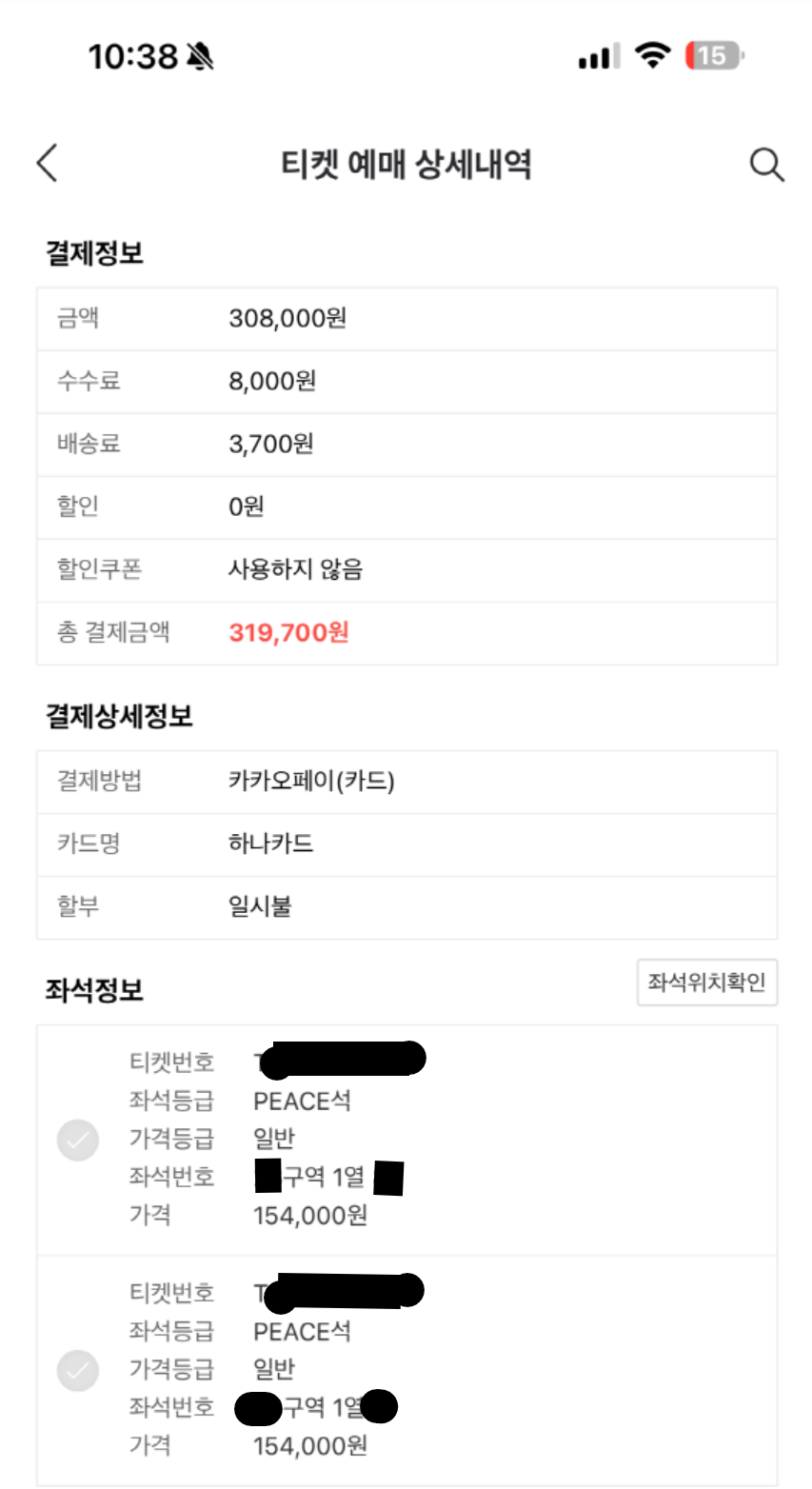 - 2장 총 결제 금액: 319,700원(예매수수료 및 티켓배송료 포함)