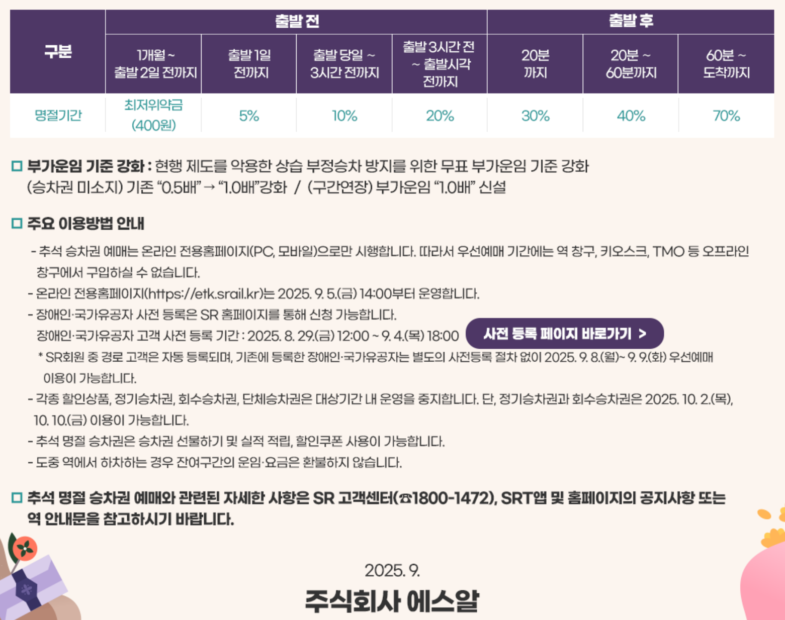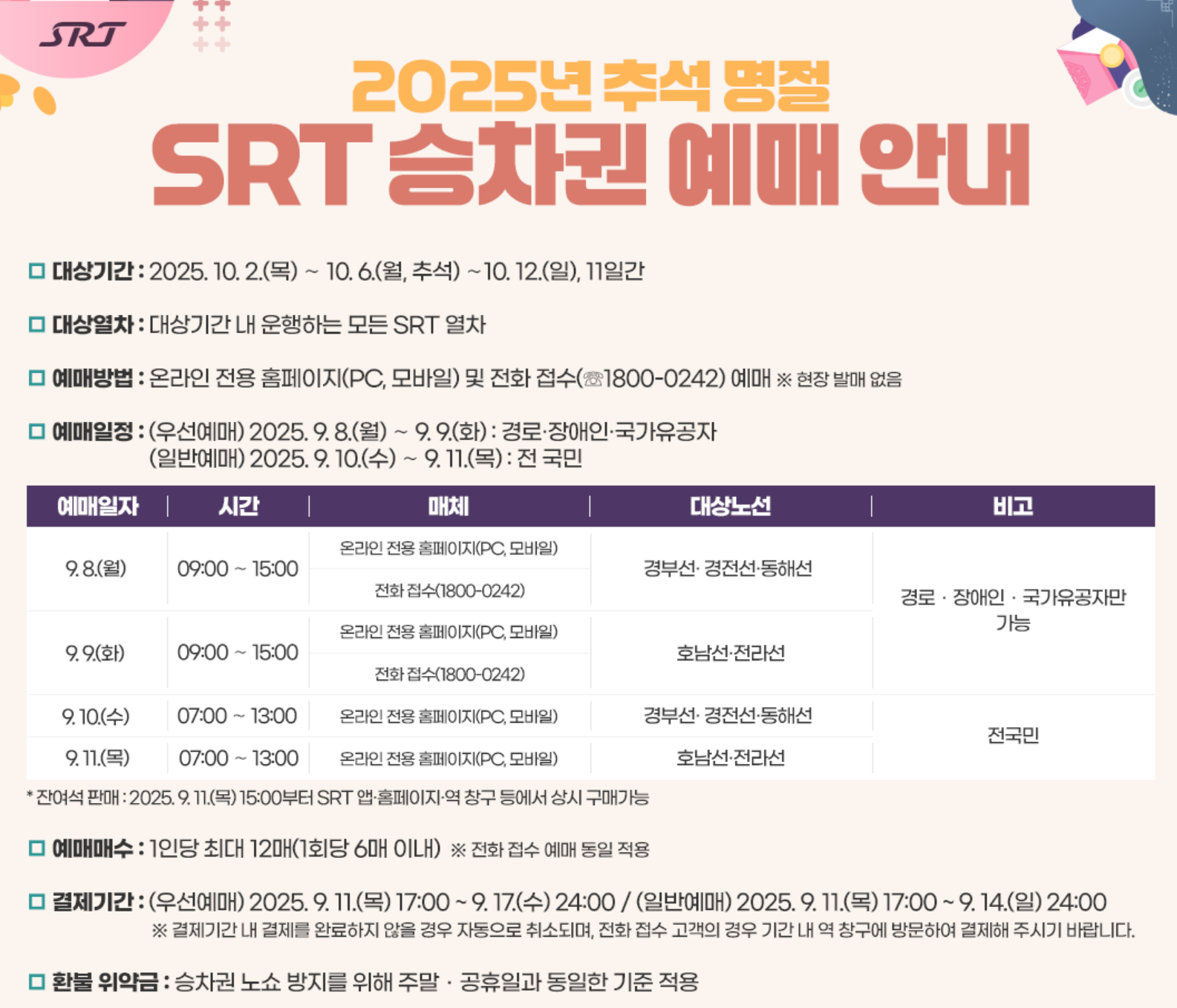 | 2025년 9월 17일(수) | 07:00~13:00 | 전 국민(경부·호남·전라선) | SRT 홈페이지·앱 |