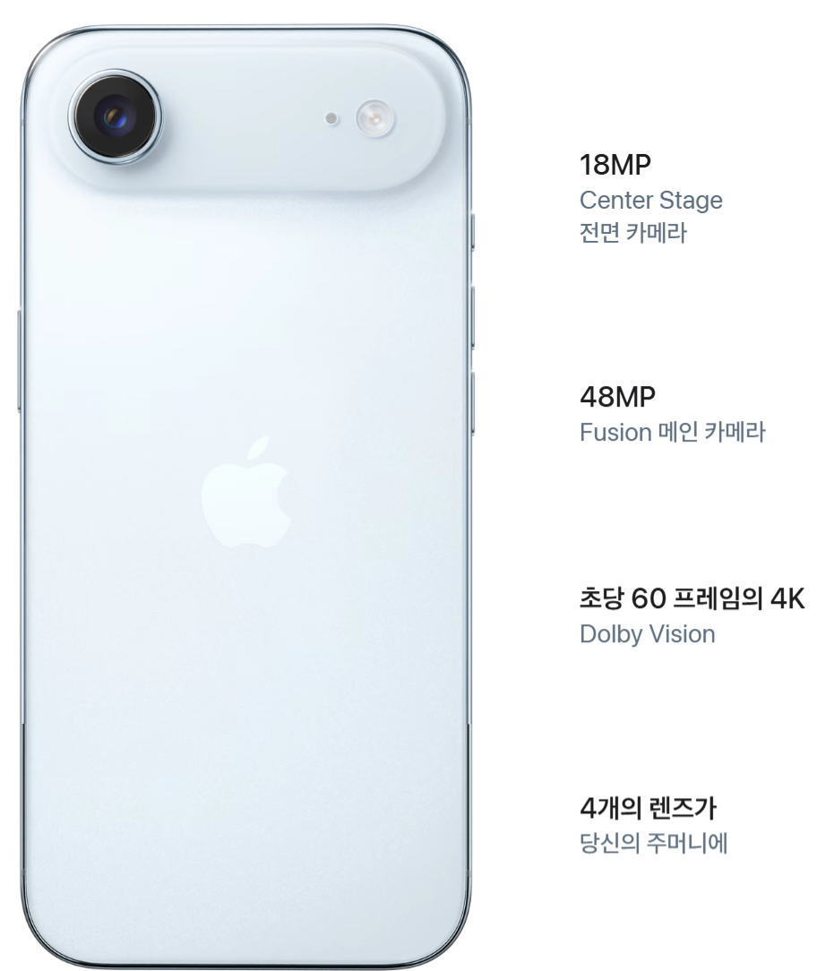영상 재생 기준 27시간 사용이 가능하며, A19 프로 칩셋이 탑재되었지만 GPU 코어가 하나 줄어든 버전입니다. 후면 카메라는 48MP 단일 렌즈지만, 멀티 앵글 촬영 기능을 지원합니다. 전면은 18MP 카메라로 센터 스테이지와 액션 모드를 제공합니다.