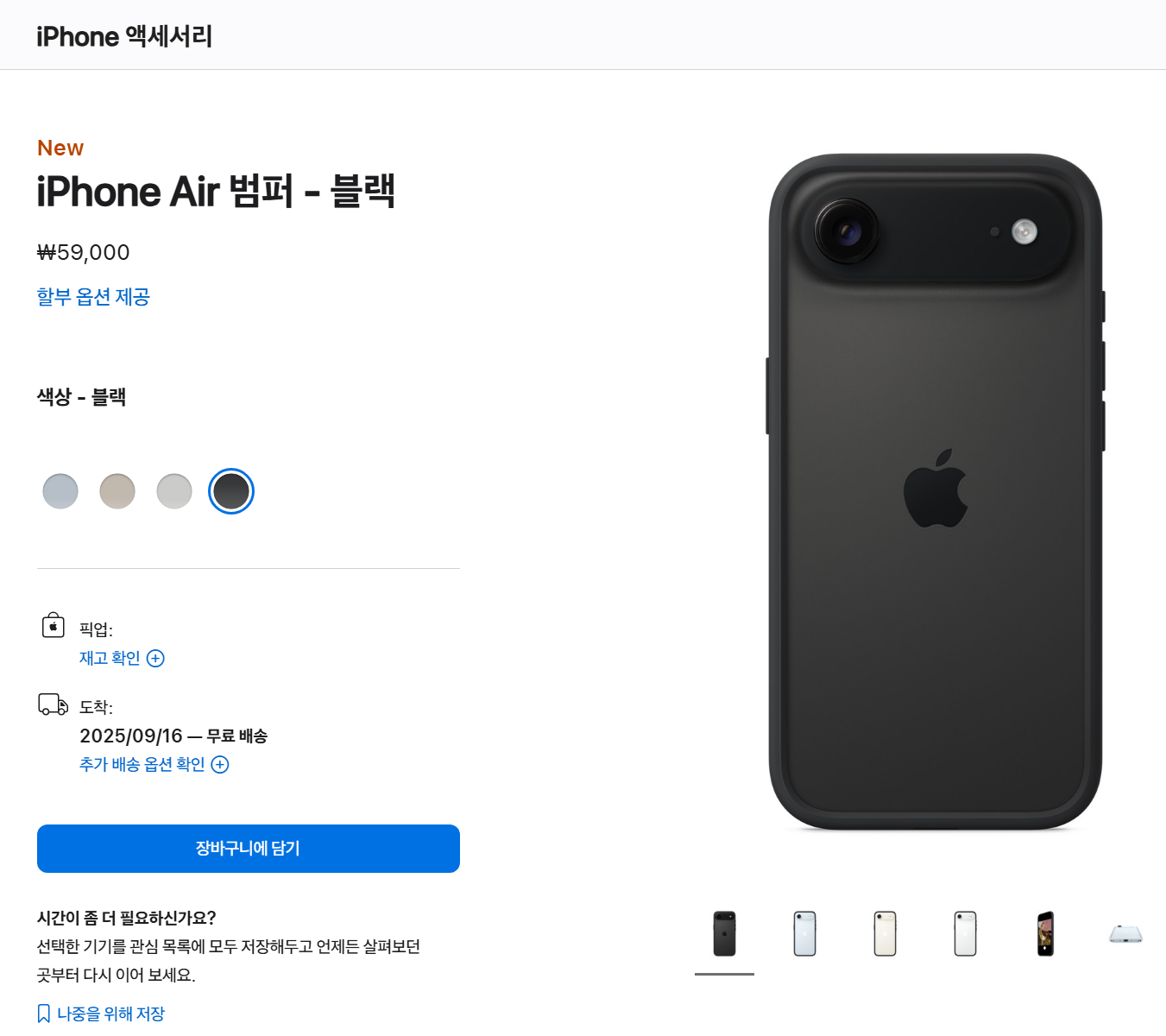 아이폰 Air 모델에는 새로운 범퍼 케이스가 등장했습니다. 라이트 블루, 블랙 등 심플한 컬러와 가벼운 디자인이 특징입니다. 가격은 ₩59,000으로 비교적 합리적입니다. (MagSafe 지원 불가)